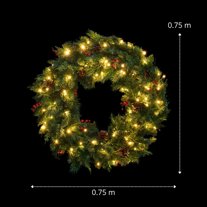 Esta Corona Navideña Verde con luces LED incluidas es ideal para instalarse exclusivamente en interiores.