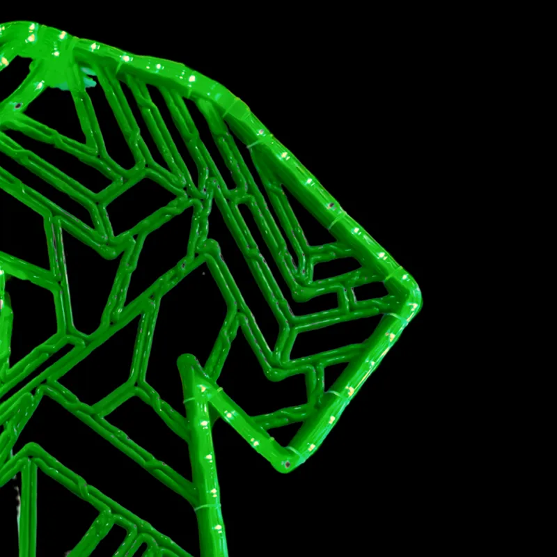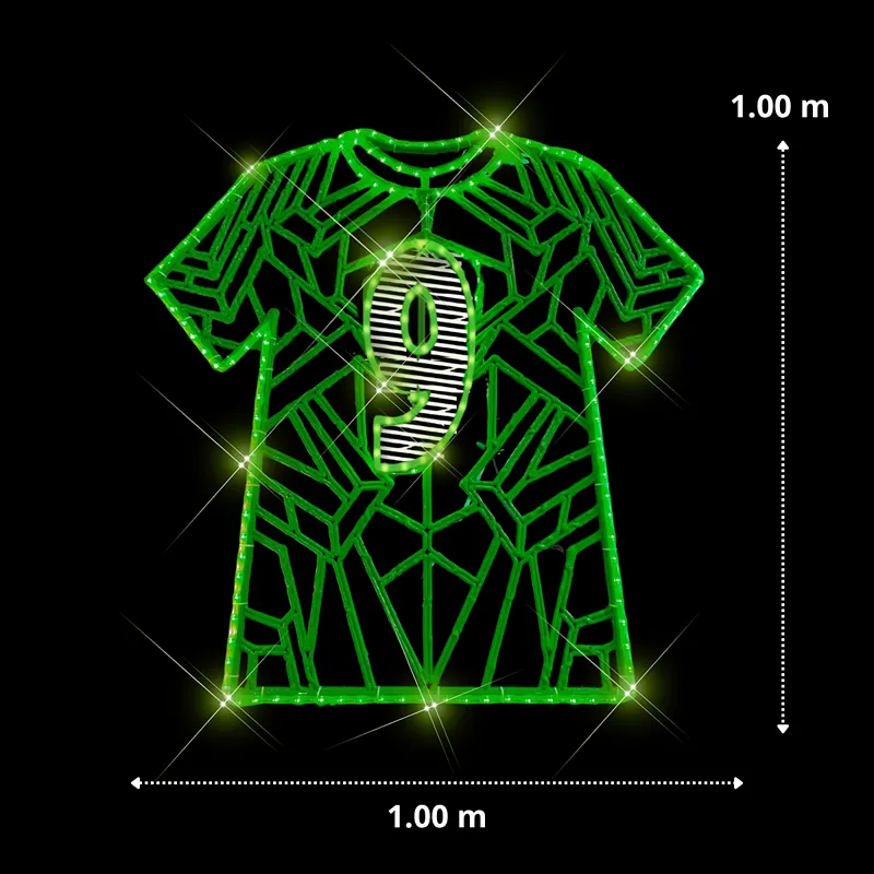 La figura de camiseta en formato 2D es una pieza de iluminación profesional de alto impacto, diseñada para ser el elemento central en decoraciones de plazas comerciales, zonas de aficionados y eventos deportivos. Fabricada sobre una estructura de Bioprint color verde y perfilada con Manguera LED Verde de alta intensidad, ofrece una silueta vibrante y nítida que celebra la identidad deportiva con calidad de grado comercial.